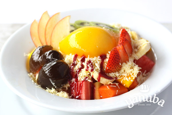 Frutas seleccionadas: Papaya, mango, melón, patilla, fresa, banano, kiwi, durazno, manzana y brevas acompañada de queso rallado y crema de leche.