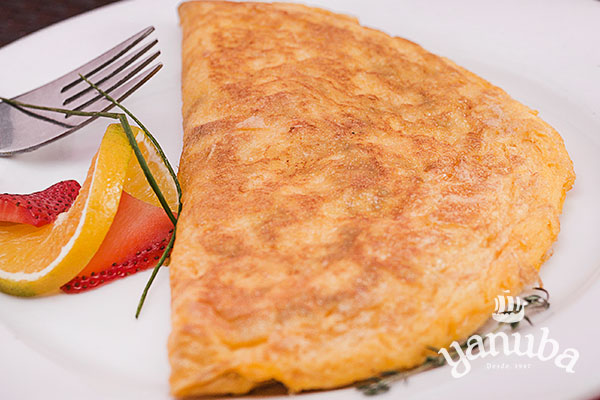 Con jamón y queso. Acompañado de fruta fresca, jugo 100% natural (naranja o papaya)
