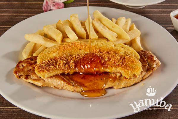 Filete de pechuga a la plancha con tocineta, miel, almendra y banano gratinado.*Contiene almendras.