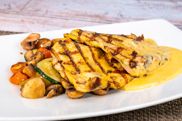 Filete de pechuga a la parrilla bañada en salsa de quesos, sobre vegetales y un acompañamiento a su elección.