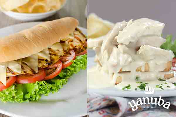 Filete a la plancha con salsa de la casa o con julianas de pollo en salsa blanca servida en tostadas.