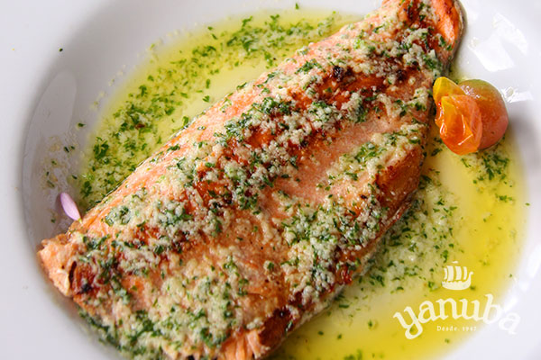 Filete de trucha a la plancha bañada en salsa de mantequilla y ajo.